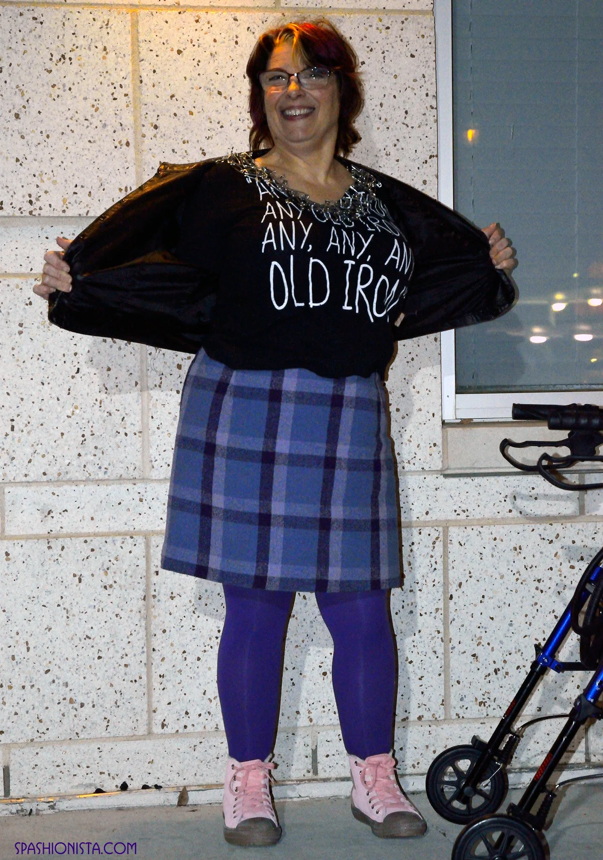 I decided to forego the typical all black uniform and opted to wear my vintageAmerican made Pendleton purple plaid skirt from Pura Vida Vintage and altered by Only One Tailoring. The shoes are fleece lined suede Converse high-tops, and I bought them specifically for events like this one. Gaining access to the venue required negotiating some stairs and I tend to scrape the top of my feet on the backs of steps as I climb - often ruining my shoes in the process. The sneakers have a toe that greatly resists scuff marks and clean up nicely with a Mr Clean Magic Eraser.